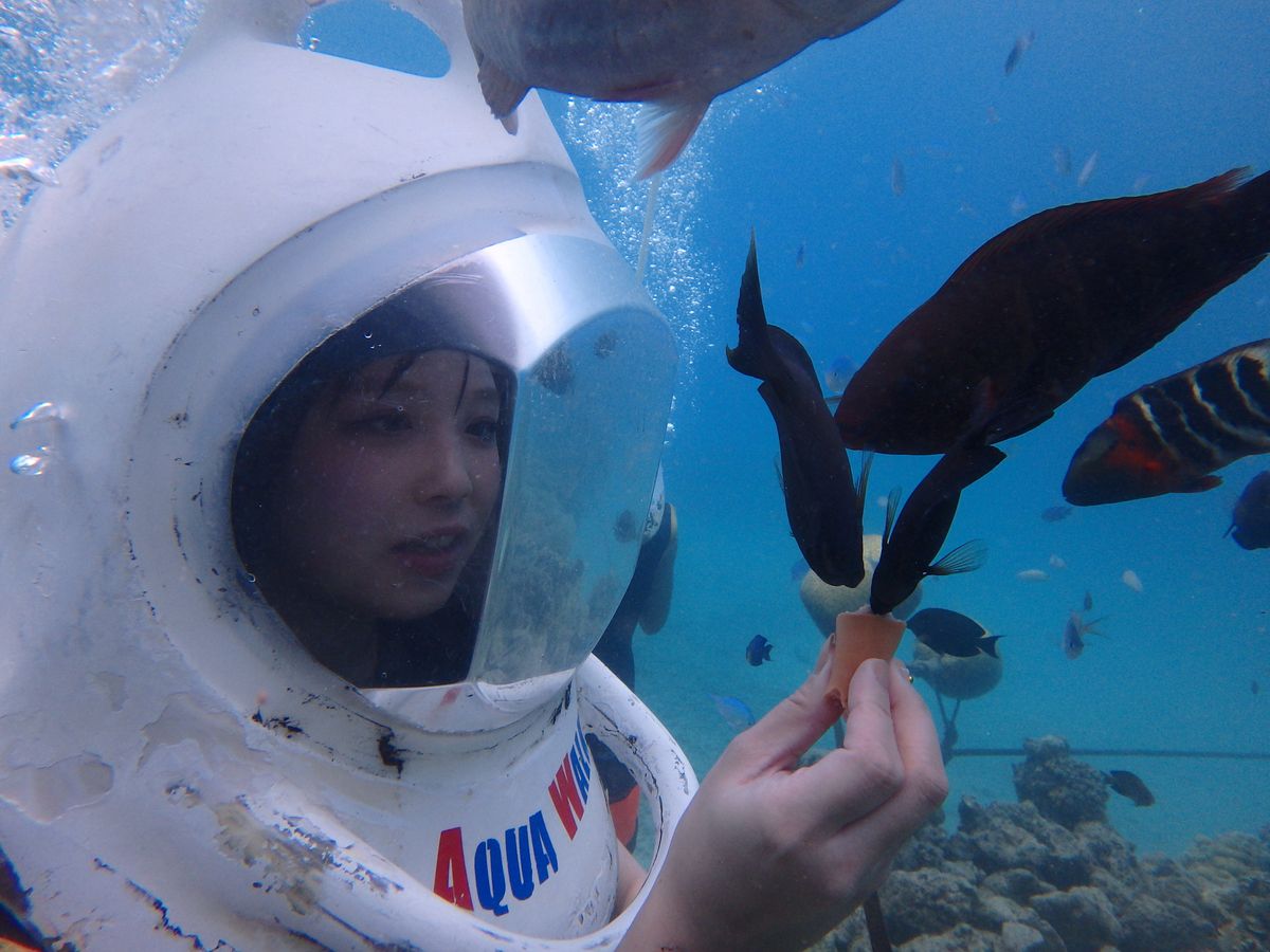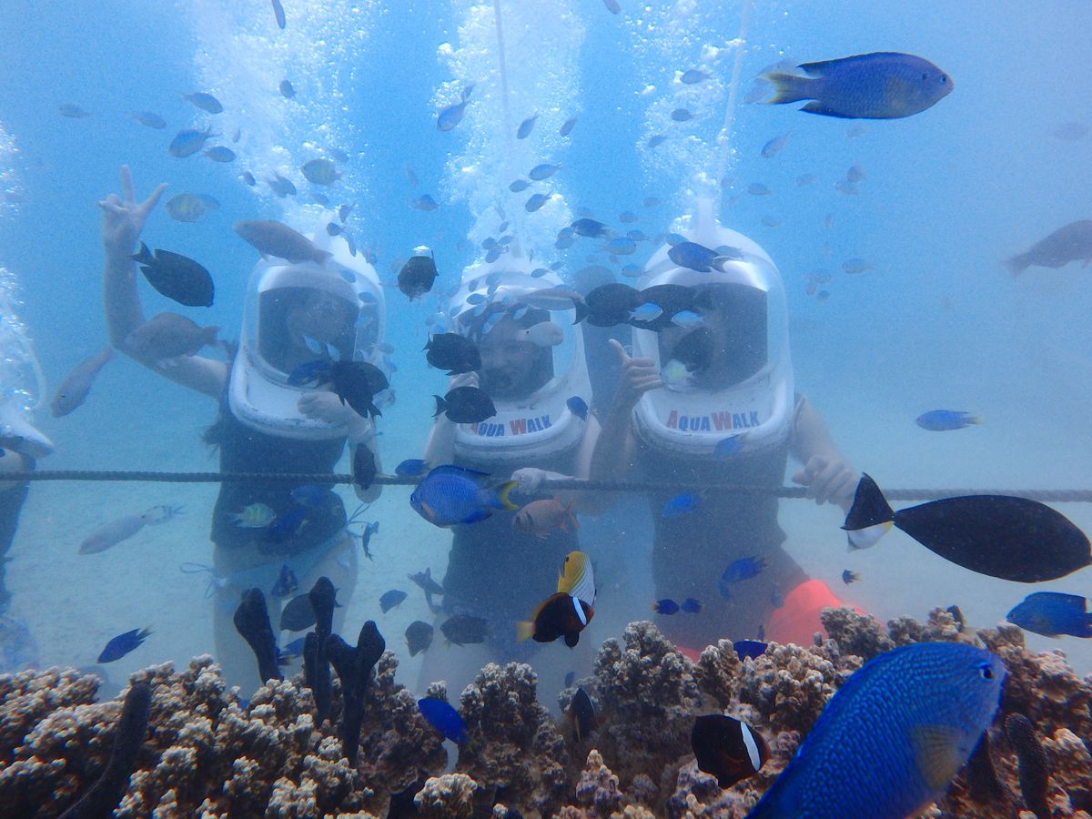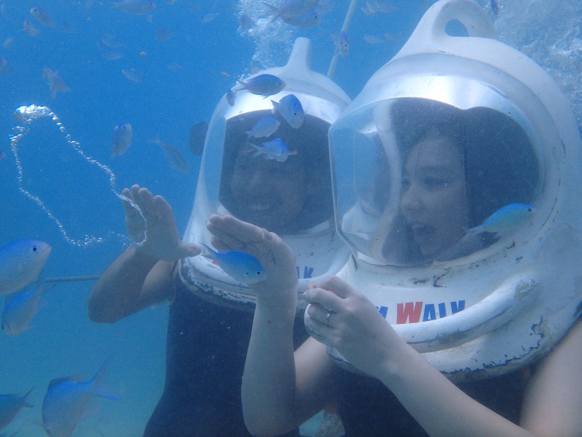 アクアウォーク ご満足頂けなく ご期待に添えなく申し訳なく思っております。安全上 どうしても 最大水深 5mの水中で 空気を送る ホースもヘルメットに付いているので、スタッフが 手の届く範囲で 待機しておかねばなりません。