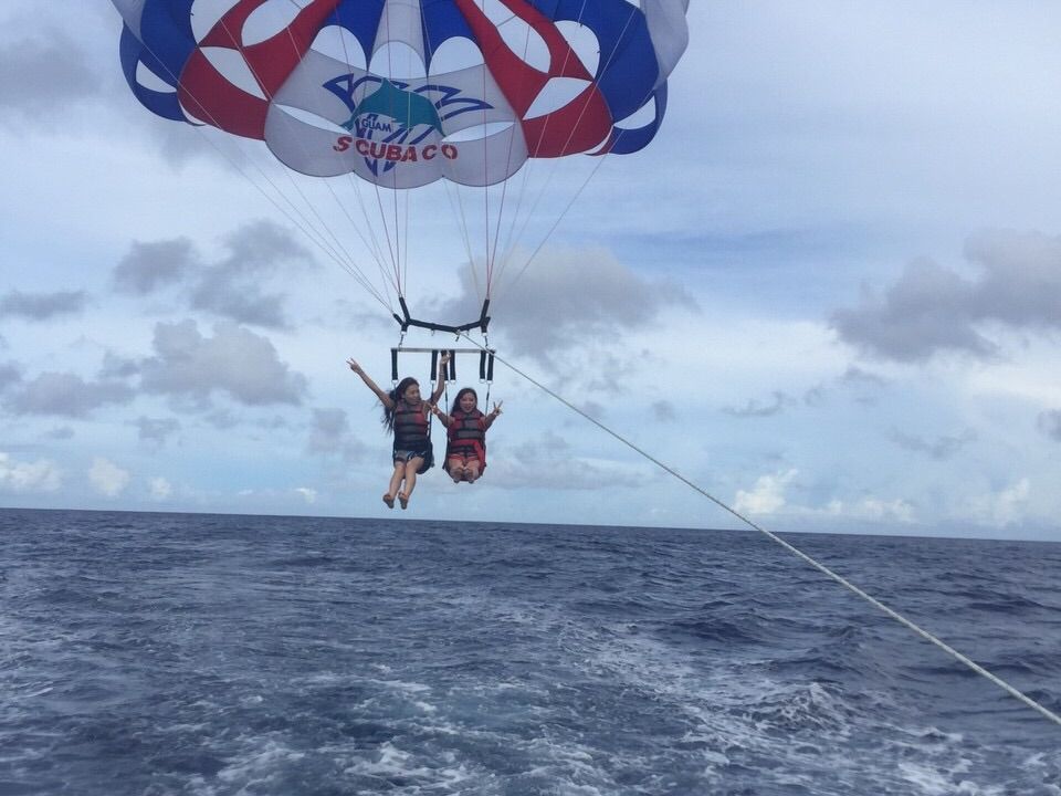 次にパラセーリングをしました朝8時半とかでお天気は曇ってましたが寒くもなく空の上はとても静かでグアムを見渡せてすっごいいい体験をしました気持ちよかった〜