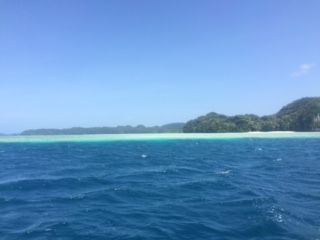 パラオのホテル街のあるコロールから、その日はやや波があるようでかなり水しぶきを浴びながら、モーターボートで片道約1時間半の航程です。