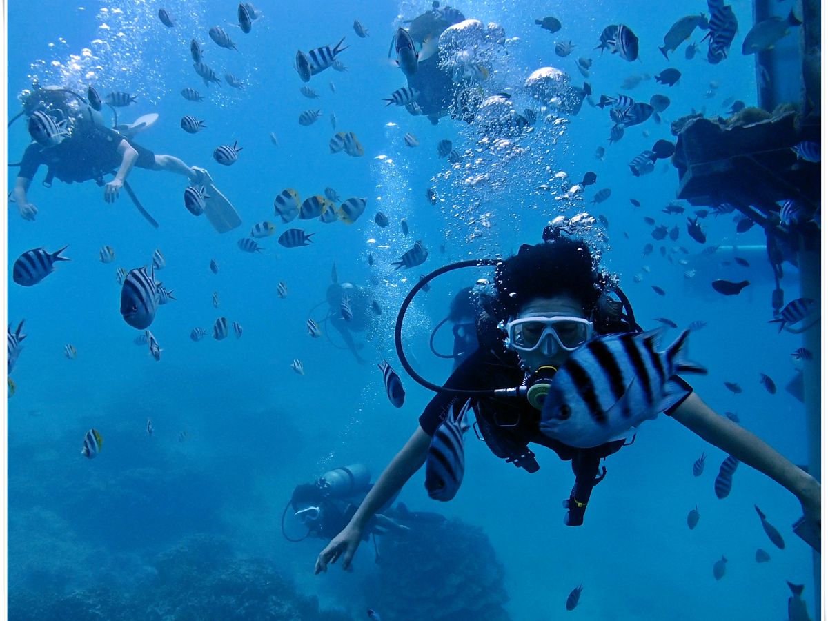 潜る時も1人ずつ指導しながらで安心してできました!海の中では魚にエサをあげて魚に囲まれ最高でした!とてもいい思い出になりました!!