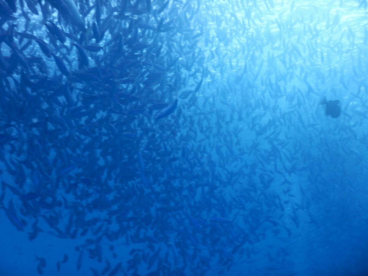 外から見たら波はすごかったのですが、潜ってしまえば全く別世界で、少し潜るだけで大きな魚がとてもたくさんいて、渡されたソーセージを散りばめると目の前に大きな魚がいっぱい集まってきてみんな大興奮!