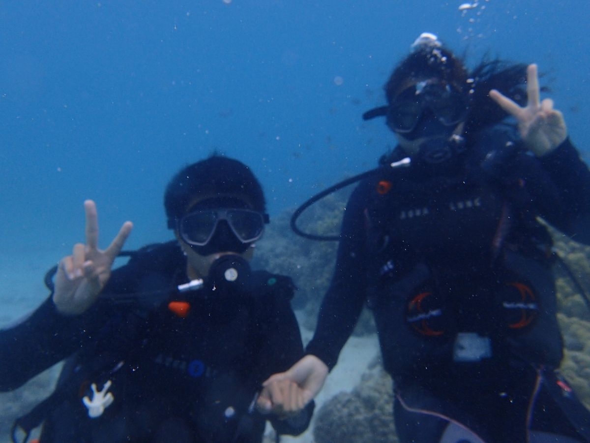ガイドのお姉さんのノリがとても面白くて、しっかりダイビングの基本をお教えて頂きつつ、みんなで楽しくワイワイさせてもらいました!最初は少し怖かったですけど、、、笑