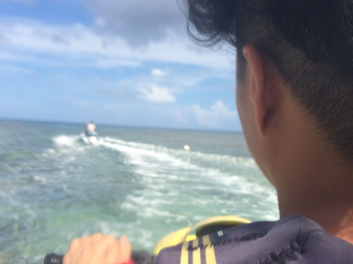 主人がジェットスキー乗った事がなかったので、長い距離乗れる、恋人岬を下から見れる、運が良ければイルカさんに会える!という事で、申し込みしましたが、大正解!海は綺麗、ぶっ飛ばせる笑。楽しかったです!グアム島を、海から見れるなんて、なかなか無いし、恋人岬も、下から圧巻でした!そして、イルカさんにも会えました☆私達のジェットの近くまで野生のイルカさんが来てくれました!ジャンプもしたりしてて、最高でした!送迎もありますし、待合場では、たばこも吸えます。お水も頂きました、鍵付きロッカーもあるので安心です。ジェットに乗る時は、裸足なので、どんな足元でも大丈夫です。水しぶきがかかる程度なので、濡れすぎはありませんでした。途中一瞬だけ雨がパラついたので、それで濡れましたが、暑すぎて晴れすぎて日焼けしまくりました^o^恋人岬で、運転手交代もしていいよっと、言って下さいました。ジェットの説明、コースの注意点は、英語ですが、お馬鹿な私でも分かったので、大丈夫だと思います^o^ありがとうございました!