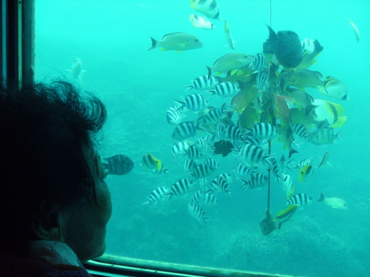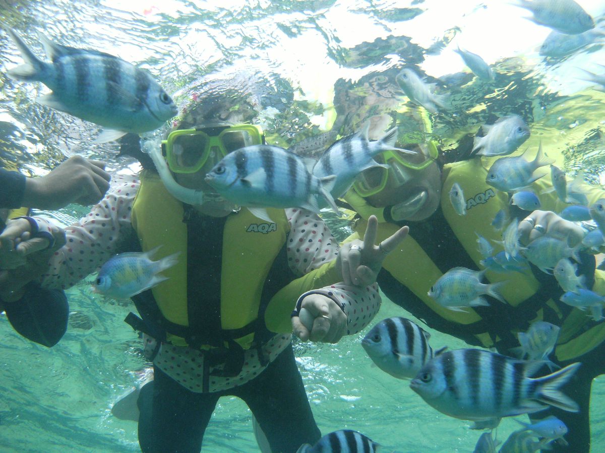 ダイビングをする私は、海の中がきれいなことや、熱帯魚が多いことは知っていましたが、今回母76才と一緒にグアムに来ました。海中の魚に感動してもらいたいと思い、このオプションに参加。母は、泳ぎは苦手ですが、ライフジャケットがあるから大丈夫。折角南の島に来たのだから、海の体験を。と話して納得。まず、海中展望塔を見て、母も感動。次にシュノーケル。インストラクターのお兄さんスタッフが、母をしっかりアシストしてくれて、母も海の中が綺麗なことに感度し、もらった餌を左手に持って寄ってきた魚にさわることができたことに感動して、とても良いツアーになりました。防水カメラを持って行っていましたので、撮ってもらったり、カメラマンの人のカメラでも撮ってもらったりして、写真でも思い出を作ることができました。カメラマンの写真は、CDにしてもらい、購入。カード払いができました。バイキングもおいしかった。シュノーケルでお腹がすくので、昼食付きにして正解。日本スタイルで、水を出してくれるので、ドリンクを必ず注文しなくてもよいのも魅力です。シャワーもホットシャワーでgood。当日は、凄い雨だったのですが、海の中は安定していて、魚が綺麗でした。母も大喜びでした。母のアシスト、ありがとうございました。