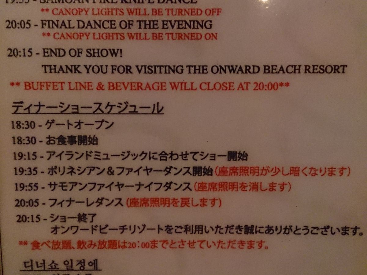 席に着くとショーのタイムスケジュール(日本語)が置いてあり分かりやすかったです。