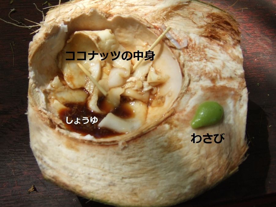 奥さんと二人で参加。奥さん運転手で、私は助手席。うちの奥さん、チョーはしゃぎまくり!!途中の休憩所で食べるココナッツの刺身がイカみたいでおいしい。