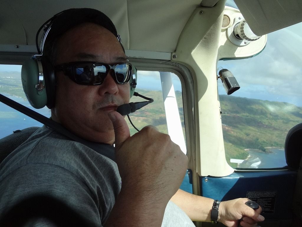 友達とショートコースに申し込んで参加しました。承諾書にサインの後、10分程度の飛行解説ビデオの中で、当日のコース変更も利用状況により可能との事だったので私はココス島まで回るコースに変更。機体の準備が出来ているので即搭乗。友人も後部座席に同乗し、グアム国際空港から離陸。恋人岬に向け旋回、高度500mを維持した操縦を存分に体験後、グアム国際空港に向け着陸態勢、後方にはデルタ航空の旅客機が着陸順位2番で私の後方を着陸灯を点灯して向かってくるのが見える。体験操縦でも着陸順は差別無いのに驚き。教官は操縦桿にほぼ手を触れず無線交信以外はほぼ自分だけで操縦させてもらえるのが素晴らしかった。