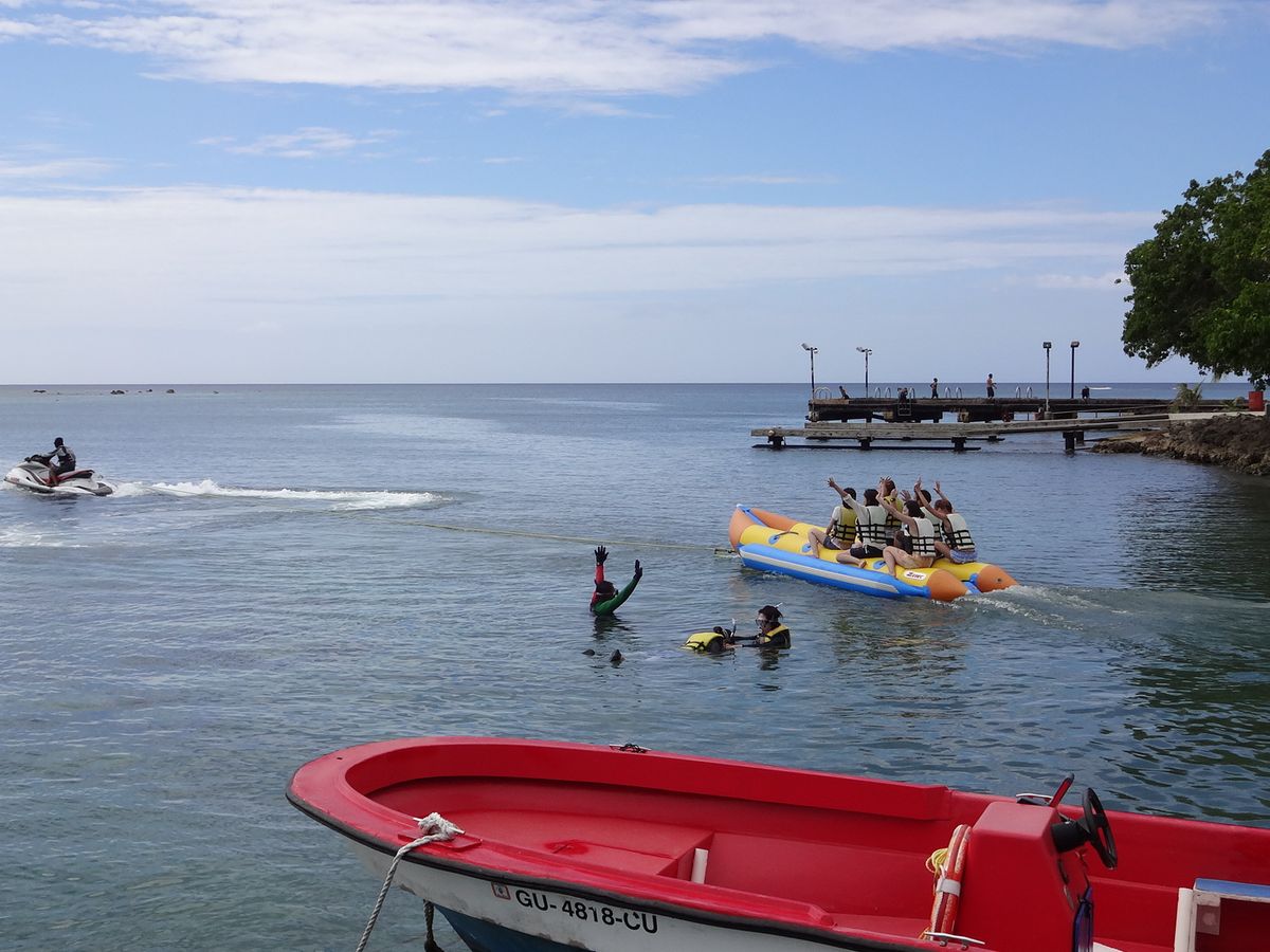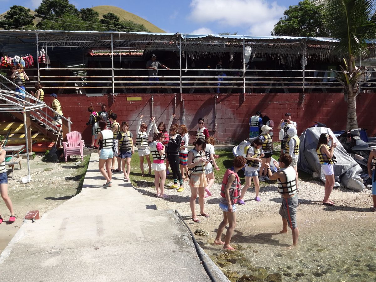 まず人数が多かったので4つのグループに分けられました。桟橋で釣りをしつ待っていると、バナナボードの順番が来ました。ものすごい早さでビキニアイランドまで引っ張って貰います。私が行った時は残念ながらひざまで水があり、ぷかぷか浮きながらジェットスキーの順番待ち。ジェットは二人で乗るのですが、娘はインストラクターに乗せて頂き大満足の様でした。