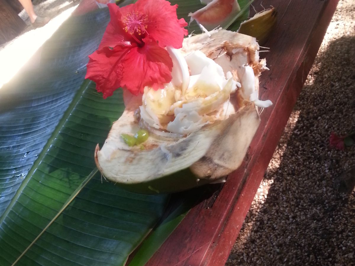 地元農園に到着 ヤシの実ジュースはお約束、ココナツの刺身なるものをわさびとおショーユでいただく、これが美味!初めての体験!