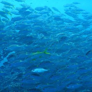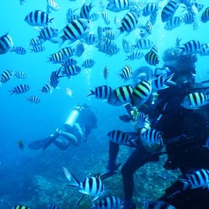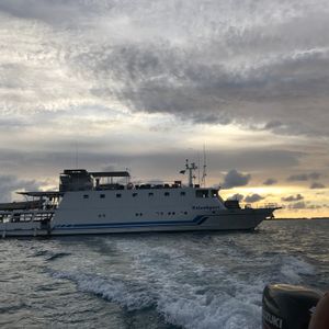 天候が悪く時よりスケールが発生するタイミングであった。イルカウォッチングは波が高く、船も大揺れだったためツアー客数人は船酔いしていてイルカウォッチングどころではない。もちろんイルカも見ることができず形だけのイルカウォッチングとなった。またバナナボートは水上バイクに引っ張られるかと思いきや船で引っ張るだけで船のスピード程度しか出ず、当然楽しくない。土砂降りの中罰ゲームのようなことさえ感じました。最後に体験ダイビングはスポットへ停泊した後、30分程度深度8mくらいの潜水。インストラクターがロープで引っ張って誘導。潜水中はボードを使っての案内はなく、少しがっかり。ただ魚はたくさん居て感動だった。ほぼダイビング1回分しか楽しめてないので価格としては高いかなという印象を持った。