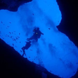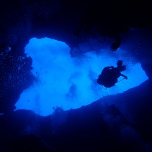 午前に2本潜りましたが、1本目は、30m以上もぐっていくブルーホール。洞くつのような中を入っていき、下から上を見上げると、入口がハート型に見えるところ。こんなに深く潜る機会はなかなかないので、そういった意味でもいい体験でした。また、違う日であれば1本目にウミガメがいっぱい見られる場所に連れて行ってくれます。ウミガメも慣れているのか近づくことができて、睨めっこすることさえできちゃいます。