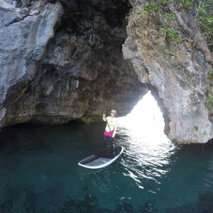 広大な海も良かったですが、洞窟を抜けた穏やかな海は本当に「癒し」の一言しか出てきませんでした。そこでは穏やかな流れで勝手に進行方向に進むので、ガイドの方が「ボードに座ったり、寝転がったりしてもらっていいですよ」と言って下さり、SUPの「立って楽しむ」というのとは別の楽しみ方もさせていただきました。ボードの上に寝転がり、綺麗な空・緑を見上げ、自然に囲まれながら、海の音・鳥の声を聴く時間は、もう言葉にならない癒しでした。