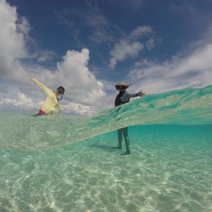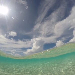 潮が引いていると、小さな島が出るような場所に連れて行ってくださったのですが、その日は潮位が高く今回は見ることができませんでした。でも、その海はタコノマクラがたくさんある白砂が広がる綺麗な場所でした。そこではGOPROに丸い附属品をつけて、海の中と海上を同時に写っている素敵なお写真を撮ってくださいました。