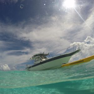 午前は体験ダイビングの説明と練習で1ダイブ、10:30に午前の部が終わり、一度ホテルに送って頂きランチと休憩をしました。午後は13:00にホテルにお迎えにきて頂き、他のツアー参加者と一緒に船で沖まで出て1ダイビングとバナナボードをしました。途中でスコールにあい、イルカを見ることは出来ず、最終的に2ダイブとバナナボードのみでした。イルカを見れなかった代わりにイルカのTシャツをプレゼントしてくれました。