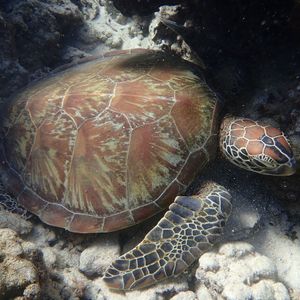 ウミガメは数十分おきに呼吸をするため海面に上がってくるので、海面でも海中でもどちらも見れました。