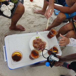 そうしている間にビーチが現れてきました。スノーケル前は海の中に立っていたパラソルは日よけに、椅子で囲み弁当でランチタイム。中央には私たちがSUP中にキャプテンが釣ったという魚(マグロみたいな食感)を刺身でいただきました。