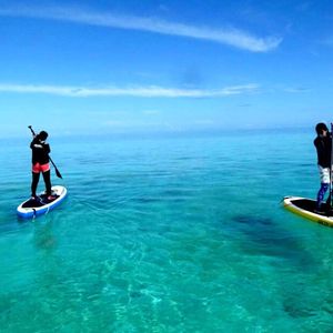 最初は初めてのSUPで不安でしたが、波の少ない浅瀬のスポットで座った状態からスタートしたので、慣れてくると自然に立って乗ることができました。海も底が透けるほど澄んでいて少し進むとまた違う色になったりととても幻想的な空間でした。