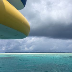 SUPのボードがまるで浮いてるみたいでした。青い海と青い空まるで、絵葉書の中にいるような感じでした。