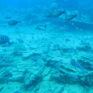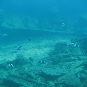 天候には恵まれませんでしたが、水中では、日本の貨物船や、米軍の戦闘機が、見られました。やや濁っていましたが、さかなに餌をやるなど、大きな魚が、集まってきました。晴れた日に見ると良いでしょう。