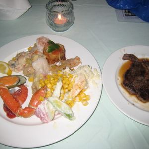 食事はビュッフェ形式で、どれもおいしかったです。特にシーフード料理が美味しかったです。テーブルのキャンドルの明かりがいい雰囲気でした。