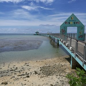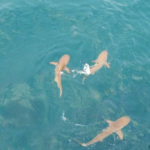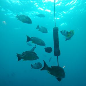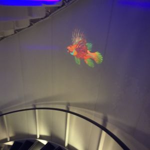 では今回どうだったのか、まず海中展望塔の手前でスタッフが餌を撒いて魚を集めていましたが、目に入るのはサメのみ。展望塔を降りて行く途中、蛍光塗料で絵が描かれています。下に降りると水族館の中の様な光景。しか~し魚がいない。どの窓を覗いてもほぼ魚がいない。唯一魚のいた窓は、何か魚を寄せるための物(これが餌付けステーション?)がぶら下がっているが、それでも魚は少ない。たくさんの魚に会えると思い、この施設のみの場合、14ドルも入場料を取る施設なのに残念な結果となってしまいました。
