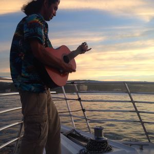 ツアーのバスは沢山の人でした。ディナー会場の近くでいくつかののコースに分かれました。私たちのコースはそれほど多くありませんでした。ガイドのお兄さんと一緒にクルーズに出発しました。あいにく曇り空でした。ほどなく海に黒いものが泳いでいたので、イルカかな?と期待したら、サーフィンを楽しんでいる人達でした。クルーズはサンセットが見られず残念でした。飲み物を飲み、ガイドさんの歌を聴きながら過ごしました。