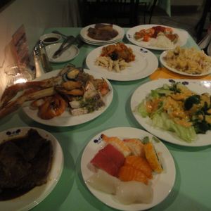 海中展望塔見学の後は、向かいにあるシーレストランでのバイキングでしたが、カニやエビ、ステーキや寿司もあり、おいしかったです!