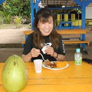 ボートを追いかけてくる沢山の可愛いイルカ達も見れ、海亀も大きなエイもスノーケルで見れ、それだけでもラッキーなボートスノーケルでしたが、その後のプライベートビーチでのランチは採れたてのヤシの実ジュースがドリンク、デザートも朝庭で採れたバナナがセットサイドオーダーはココナッツミルクと言う街中では味わえないフルコースでした(笑)