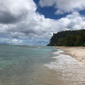 そしてまた車に乗り、一時間ほどかけて、ファイファイビーチへ向かいます。車を降りてビーチまで少し歩きます。少し険しい場所もありますが、ビーチサンダルの5歳の子も歩けるくらいです。着いたらすぐにチャモロ料理のランチです。黄色いご飯と骨つき肉。少し辛くて子供たちは食べれませんでした。冷たい水は飲み放題です。ジュースやお酒は販売してました。日本語ぺらぺらの現地の方がいろいろ説明してくれますので、安心でした。ヤシの実のジュースを飲ませてもらい、家族ごとに順番に海、洞窟、バギーと回って遊びます。ビーチは砂ではなくサンゴでゴツゴツしてます。(マリンシューズを貸してくれます。)浅くて波も穏やかです。海の中にはかわいい綺麗な魚がいっぱいいました。5歳の息子が魚に足を噛み付かれてもう入るのが嫌だと言うので、ヤシの木のブランコやトランポリンやカヌーに乗って 遊びました。中学生の兄達は潜って遊びたかったと不満をもらしてましたが(浅すぎて 潜れませんでした。)午前中はアクティブに午後から は のんびりと過ごせる楽しいツ アーだと思います。