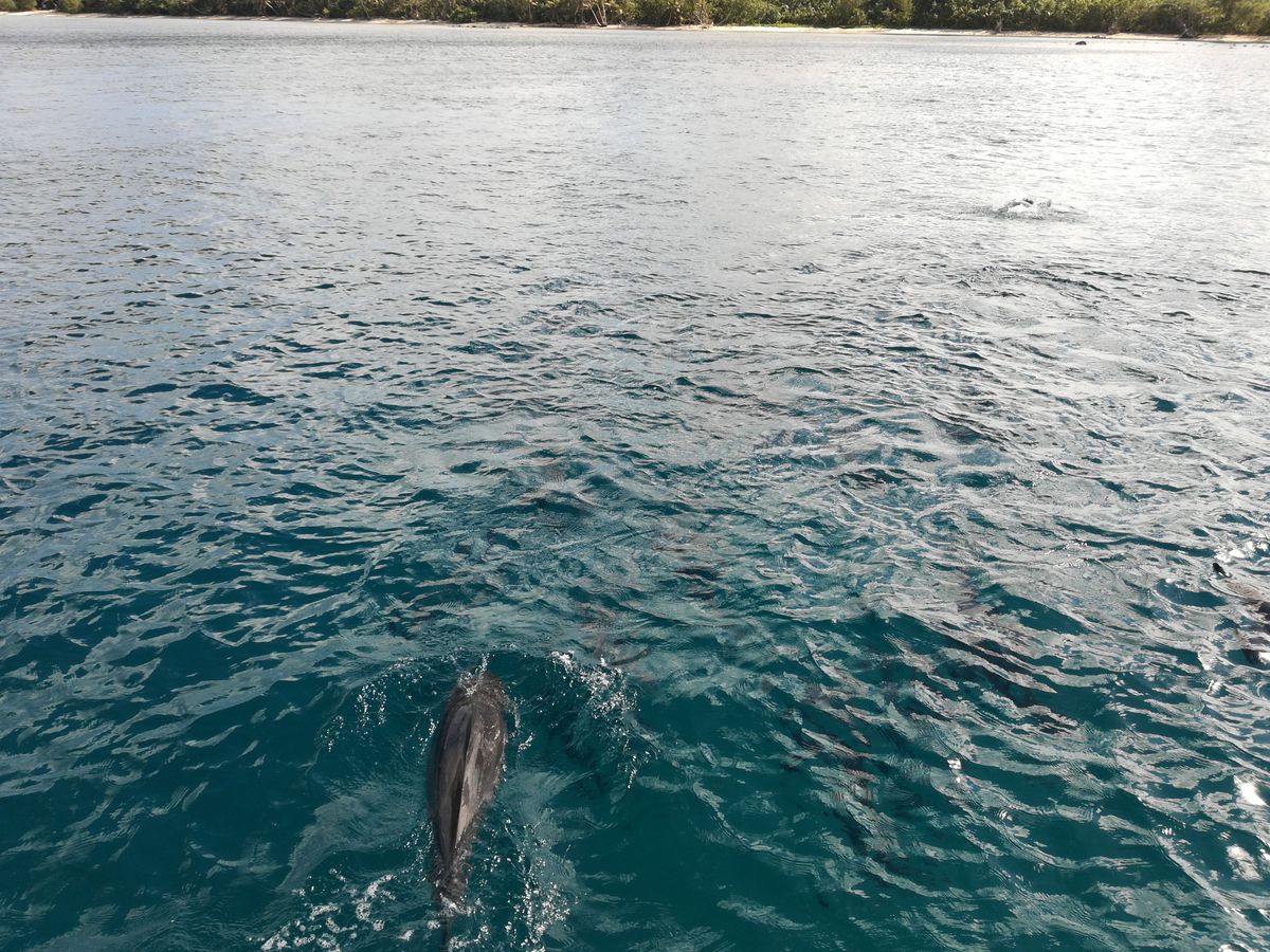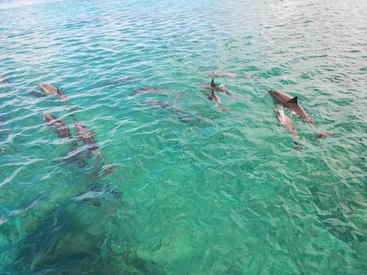 本当にたくさんのイルカ達と会う事が出来ました。イルカはボートの前や横に沢山集まって来て、ジャンプしたり、ボートの波に乗ってすごく楽しそうに遊んでました。ゆっくり進むとずーっと並走、スピード上げるとまるで競争してるかのように、とにかく負けまいように猛スピードで、ボートの前をガンガン泳いでました。こちらも頑れ!って応援しちゃうくらい、凄く楽しかったです。シュノーケリングも沢山の魚達が居て、まるで水族館の中に入っているみたいで楽しかったです。