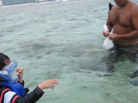 今回、グアムデビューの子供2人を連れて参加しました。海の透明度が良く、魚(熱帯魚など)も餌付けをすると掌に入り込んでくるくらいです。また、ガイドの方々も親切、ユーモアがあり楽しい時間を過ごすことができました。さらに、洞くつ探検、ラッテストーンを観たりしてチャモロ文化にも触れられるので是非参加してみてください。