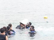 3回目の参加です。今回は幼児がいたので、2グループに別れて体験しました(潜っていないグループが子どもと一緒にシュノーケリング等して過ごす)。 事前説明では、ジョークと日本語を交えながら耳抜きや水中でのハンドサインを楽しく教えてくれます。 いざヘルメットを被り、ロープを伝って海中へ。ソーセージを渡してくれて、目の前でカラフルな魚を見ることができます。水中ジャンプさせてくれたり、バブルリングを見せてく