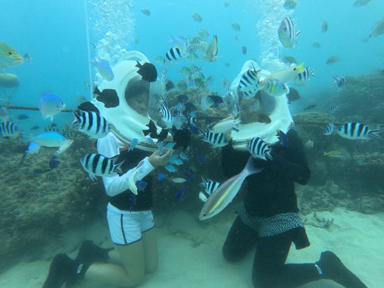 海底散歩を今回初めてしました。 子供は、はじめに降りて1人の不安から断念。 魚がすぐそばに来て凄かった。