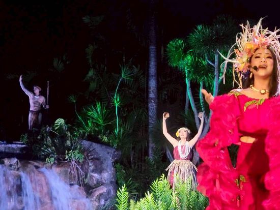 ディナーショー会場のフィッシュアイマリンパーク・ビジターセンターに到着。玄関入口に並ぶ本物のティキ像を見ながら中に入ると、熱帯植物に囲まれたラグーンと滝に面したガーデン・レストランへ。潮風にそよぐヤシの葉と星空を見ながら、グルメディナーをお召し上がりいただける開放的なシアターレストランは、トロピカルムードいっぱい!