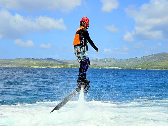 ジェットスキーの噴射口とつながれた特殊な道具を使い、足元から噴出される水圧によって海上に浮かび上がる体験をお楽しみください♪