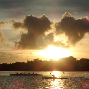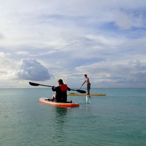 始まる頃は、やや日差しが射していましたが、曇りに変わってしまい楽しみにしていたサンセットは厳しいと言われてしまいました。初めはボードから立てず四つん這い状態で、立ててもバランスを取るのが難しく、風にも流され、パドルを漕ぐ力がなく前に進めませんでした。ですが、徐々にコツも掴めゆっくりですが風を感じパドルを漕ぐ事ができました!SUPのゴールは桟橋までと言われ、中々の距離で、途中漕ぐのに疲れてしまい、座りながら漕ぎながらグアムの風を感じながらSUPをする事ができました。各自で写真を撮る事もでき、またインストラクターの方がカメラで撮ってくれて素敵なショットになりました。途中、写真を撮る事に夢中になりすぎパドルを落としてしまうハプニングもありましたがこれも旅の良い思い出となりました。40分程SUPを行った後は、ゴールの桟橋付近でシュノーケリングを行いました。海も深く足が着く事はできませんが、ボードの上から顔を付けて海の中を見る事もできます。インストラクターの方から魚の餌を貰い、海の中に潜ってみることに。