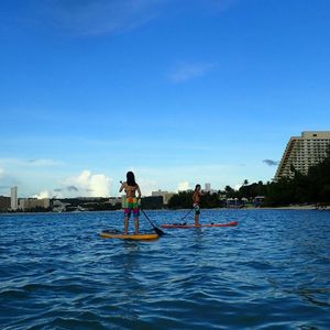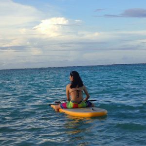 初めてのグアムでした。初めてのスタンドアップパドル!とっても楽しみにしていました。しかーし、お天気はスコール?雨、曇りで結果的にサンセットは見ることができませんでした〜|( ̄3 ̄)|くそぅ、昨日にしておけば!でも、とーっても楽しい時間でした!!!順をおってお話ししていきます。まず、ホテルについたら電話をくださいと言われていたのに電話を忘れ、出発1時間くらい前に慌ててかけました。電話は日本語でまったくok!安心です。電話口からカラッとした方でとっても好印象です!お天気の具合をみてまた電話くれるということでお部屋で待っていました。電話ではお天気はアレだけど、波はそんなないし平気とのこと。ただサンセットは見れないでしょ〜と。やりたい?と聞かれたのでやりたい!って言ってやることになりました。お迎えに来てくれて向かうところから土砂降り!ンマーこんなんで出来るのかなあ〜と。一緒にいったのはお母さんで、お母さんは海苦手、泳ぎ苦手、運動神経悪いときていますので、とっても怖がっていました。ごめんね。海は来たかったイパオビーチ!やっぱりキレイでした〜)^o^(まあ海をみて、まあ平気そうってことで用意を開始。雨が小雨に。ラッキー!スタンドアップパトルってサーフィンみたいなボードでやんのかなあって思ってたら膨らますやつでした。ほほ〜。海にいって早速練習!できる!と思ってたけどやっぱり出来る(^^)!わーいわーい!お母さんも怖い怖い言ってたけど挑戦。海に落下!掌を負傷!ンマー。でもそれからも練習。立つのは無理で、座るようのイス的なものを用意してくれました。お心遣いが嬉しい。座るようのやつだとカヌーみたいになりました。安定してて海に落ちないし、慣れたみたいで自分の思ったところに移動も出来るようになっていました。楽しくなっててよかった!シュノーケリングもできるってこよでシュノーケリング!海の中とってもキレイ〜(^ ^)お魚もたくさん!足のつく範囲でもたくさんお魚いました!パンをあげると来る!嬉しい!夢中でシュノーケリング。スタンドアップバトルのボード?があるとシュノーケリングしてても疲れたらそこで休めるし、深いところに行ってもいつもより怖くない!素晴らしい発見でした(^^)お母さんはボードの上から顔だけ覗き海の中を見ました〜!夢中でシュノーケリングしてると上はスコール!雨がもっとひどくなってきてあがることに〜。またホテルまで送ってもらって終了です。帰りの車の中も暖房を効かしててくれて寒くなく帰ってこれました(^ ^)お心遣い嬉しい!