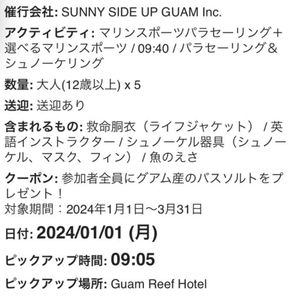 パラセーリングは初めてで、高い所は苦手な方ですが、思い切ってグアムに着いてから翌日9:30の日程で申し込みをしました。当日は、天候にも恵まれて、サイコーの思い出になりました。