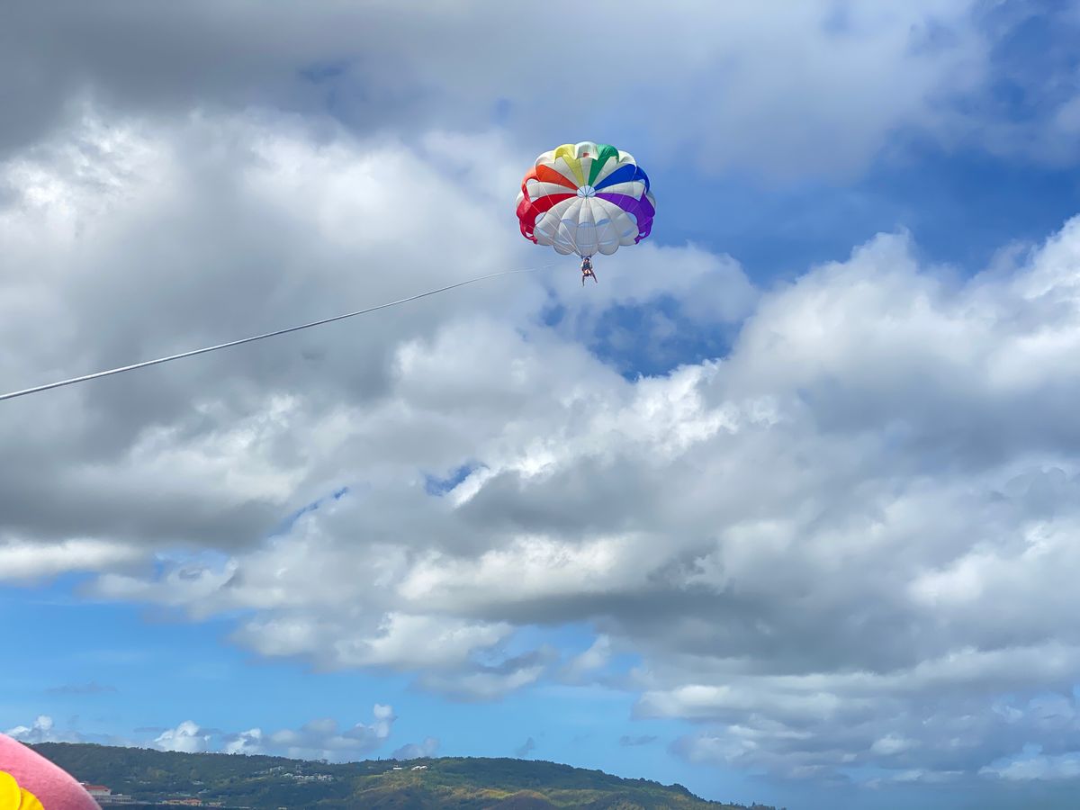 ジェット船に乗り込み、STAFFの方が親切にライフジャケットやパラセイリング用ベルトをつけて下さり、波しぶきや海風が激しいので若干スリリングを感じながらそうこうしているうちに可愛い虹色のパラシュートが!超映えます。とにかく映えまくる。