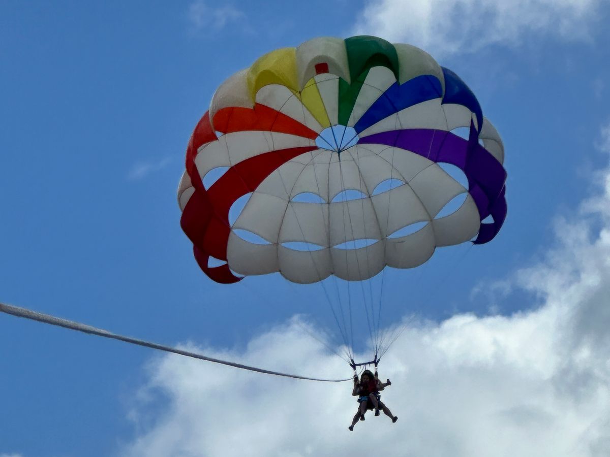 とっても綺麗で最高でした!7.8分は上に上がってたかな?すごい長く上げてくれて楽しかった!ジェットスキーも15分間乗り放題で彼氏と二人乗りで交代で運転しました。写真も撮ってくれて楽しかった!ビーチバレーもできたりカヌーもあったり半日楽しめましたー!午前中おすすめかも!
