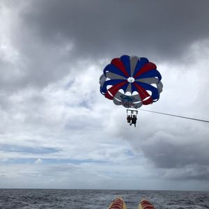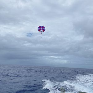 はじめに、パラセーリングにいきなり飛ばされました。パラシュートをつける前、スポットに行くまでの船の運転もだいぶ遊ばれます笑