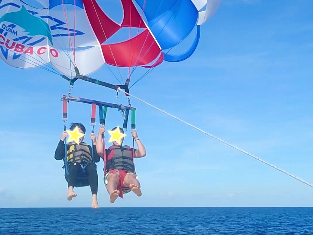 午後の便で帰国予定だったので朝イチ、パラセーリングだけ申込みました。想像以上に高く上がり気持ちよかったです。一緒に参加した娘はグアム旅行で1番楽しかった!と言っていました。港に戻る時に泳いでいる亀を船長さんが見つけて教えてくれ、息継ぎしてるところが見れましたよ〜。素敵なおまけ付きでした(笑)