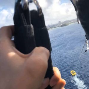 パラセーリングは季節により風向きが変わるため出航する港が変わるそうです。また当日の風速などによってパラシュートの大きさを変えているそうです。港から沖合に出るときバナナボートに乗り、沖合からグアム島に戻りながらパラセーリングを行います。