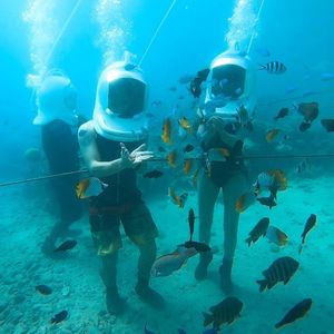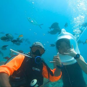 四方がガラスでできていて熱帯魚たちが見れるようになっています。ヘルメットの中に空気が自動で入ってくるため、ヘルメットを被るとき・脱ぐときの少ししか水に濡れません!そのためメガネを付けたままでもアクティビティーができます‼️ 水中では話ができないため、安全確保のためにも予めレクチャーされた合図をキチンと理解しておくことが大切です。また水中で耳抜きをするため少なくとも小学生以上のお子さんがちょうど良いのではないかと思います!