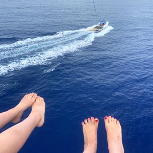 楽しみにしてたパラセーリング、、ゆらゆら空中飛行〜写真や動画をたくさん撮ろう!と思っていたのですが、実際は絶叫アトラクションでした。ガイドさんのおふざけ?で、猛スピードの中海面にバシャバシャお尻をつけられてから、いっきに浮上。夫婦揃ってロープから手を離せず、写真1枚も撮れなかったです(T-T)