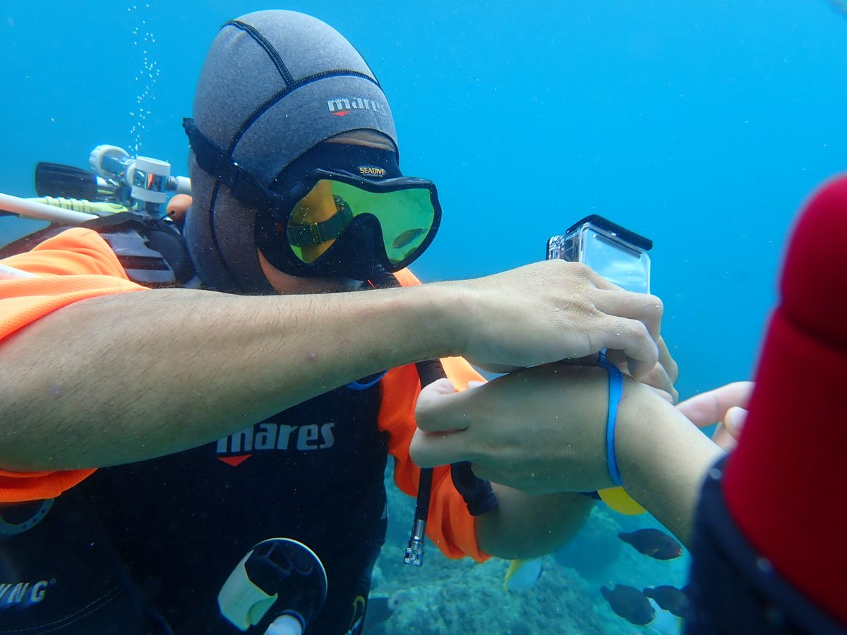 四方がガラスでできていて熱帯魚たちが見れるようになっています。ヘルメットの中に空気が自動で入ってくるため、ヘルメットを被るとき・脱ぐときの少ししか水に濡れません!そのためメガネを付けたままでもアクティビティーができます‼️ 水中では話ができないため、安全確保のためにも予めレクチャーされた合図をキチンと理解しておくことが大切です。また水中で耳抜きをするため少なくとも小学生以上のお子さんがちょうど良いのではないかと思います!