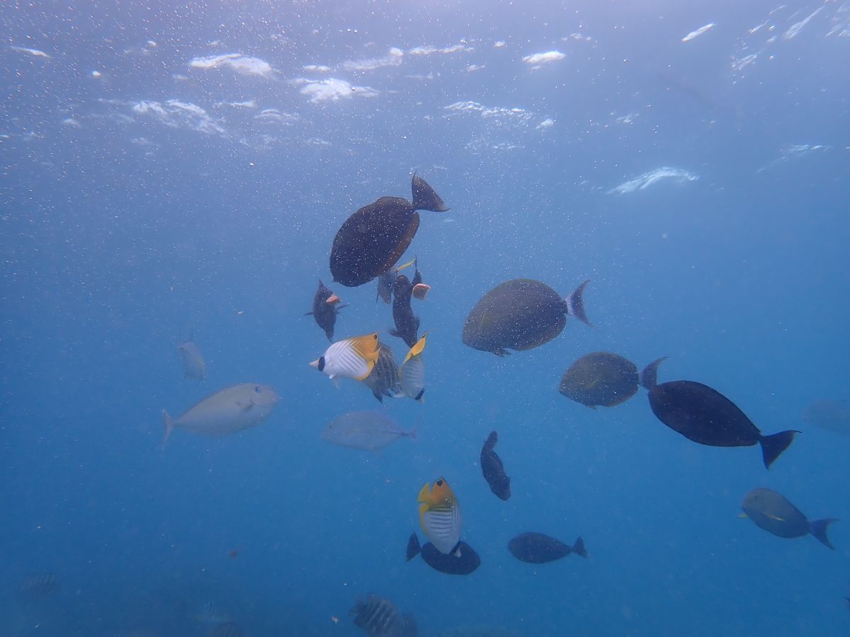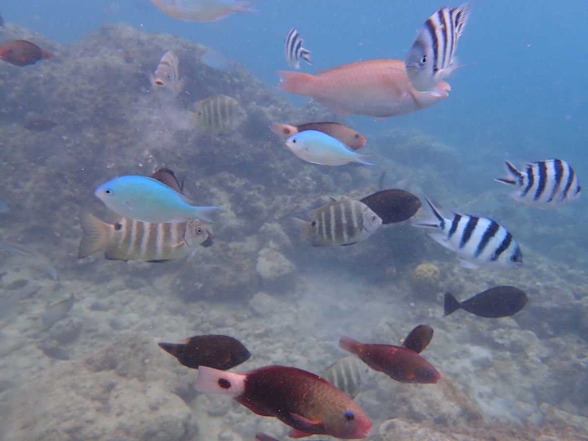 歩いて海へ潜ると、色とりどりの魚が近寄ってきてくれます。