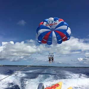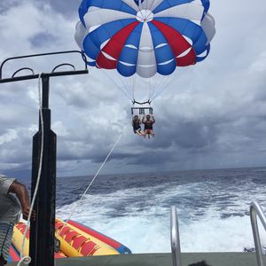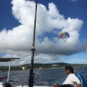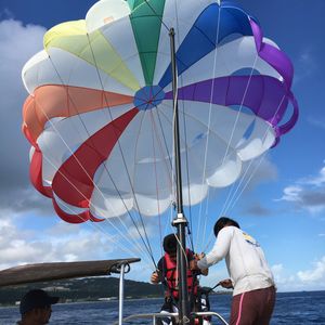 パラセーリング初体験!空から見る海は真っ青で最高でした。帰りは、バナナボートで岸近くまで行けたので、船酔いすることもなく楽しんめました。帰りの車のシートに敷いてあったタオルも清潔で肌触りよく、スタッフも面白くまた利用したいです。