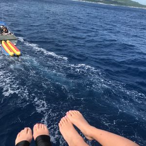 バナナボートは、陸からだいぶ離れた所まで船で行ってからだったので、落ちたらちょっと怖いなぁと思っていましたが、振り落とされるのを楽しむものではないと思うと、逆に安心して楽しめました。 落ちたら落ちたでちゃんと拾ってくれるという説明もあったので安心でした。