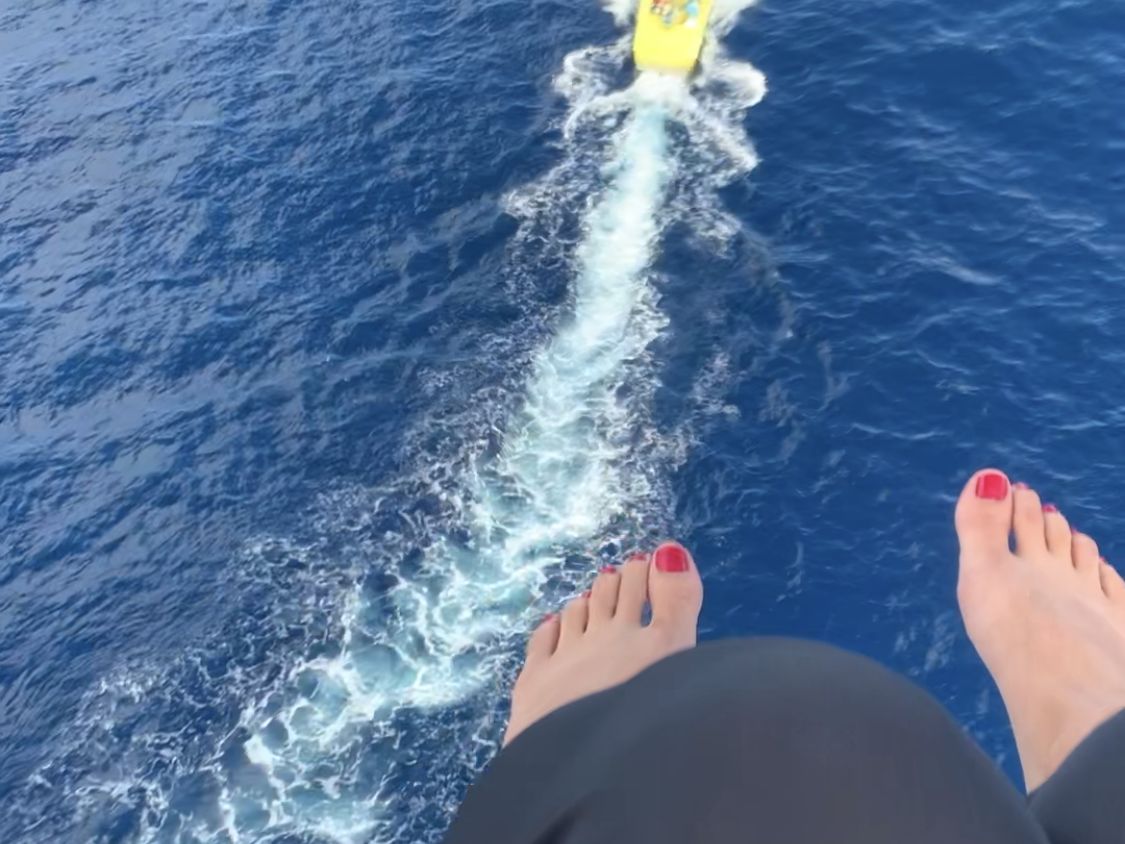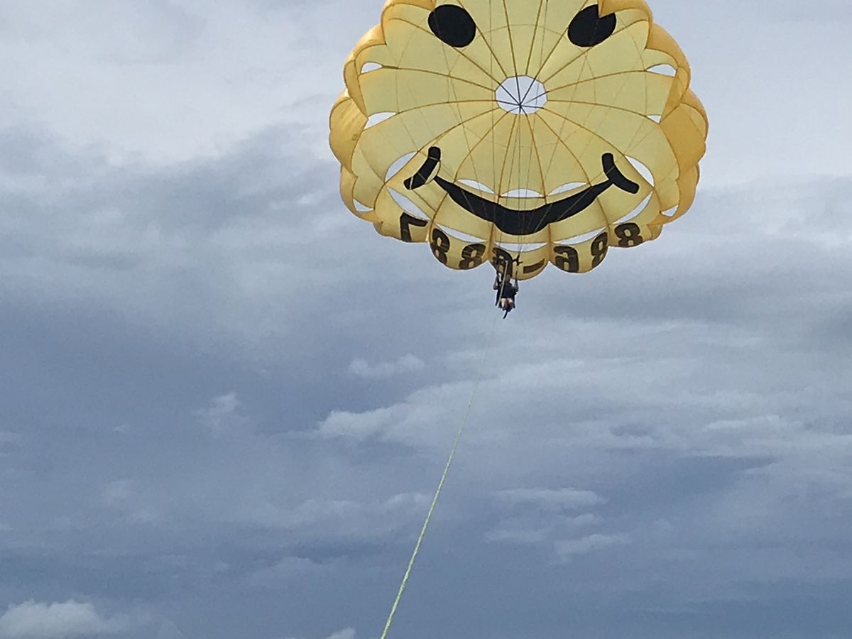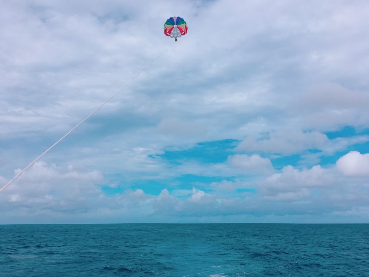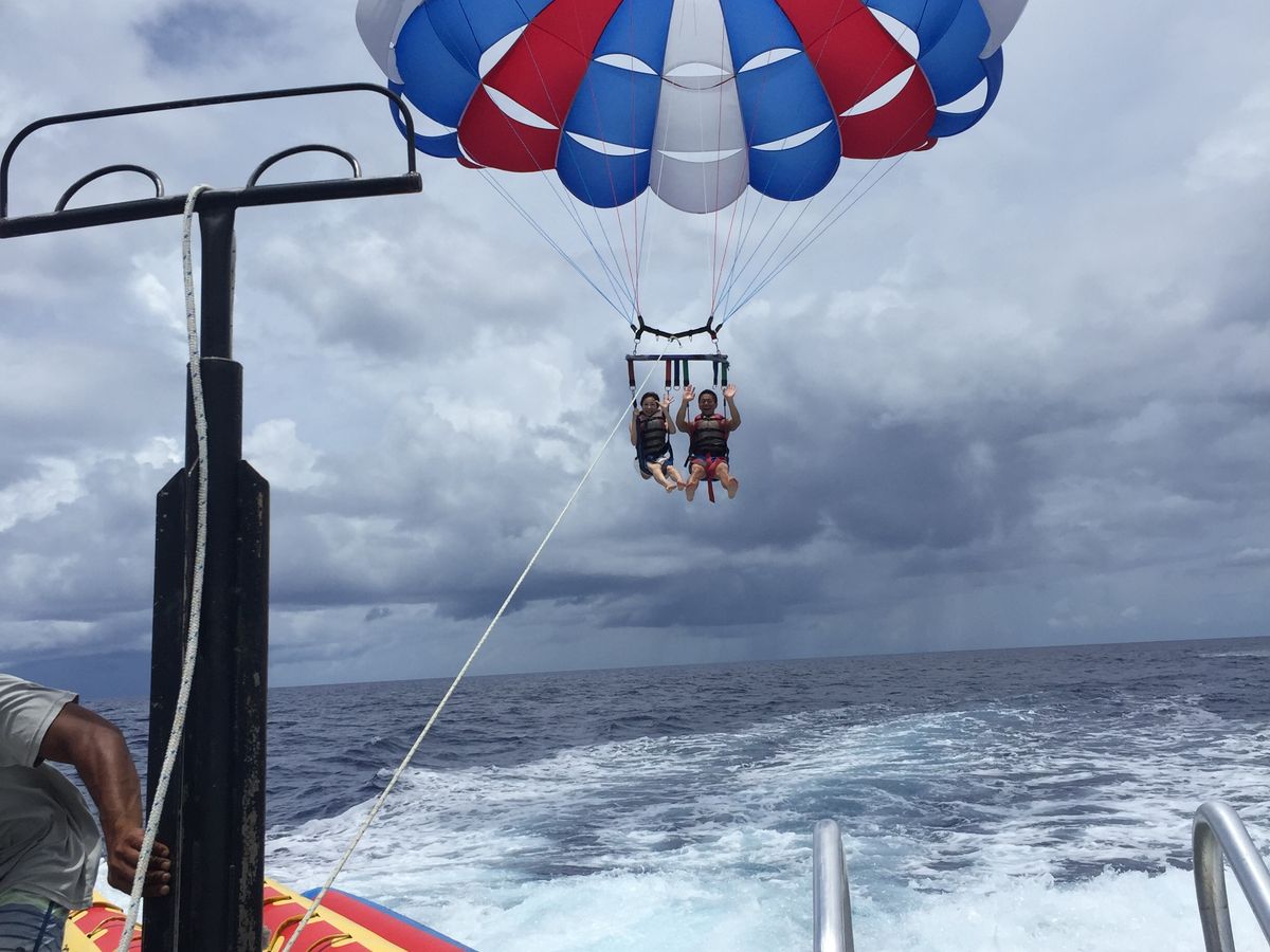 楽しみにしてたパラセーリング、、ゆらゆら空中飛行〜写真や動画をたくさん撮ろう!と思っていたのですが、実際は絶叫アトラクションでした。ガイドさんのおふざけ?で、猛スピードの中海面にバシャバシャお尻をつけられてから、いっきに浮上。夫婦揃ってロープから手を離せず、写真1枚も撮れなかったです(T-T)